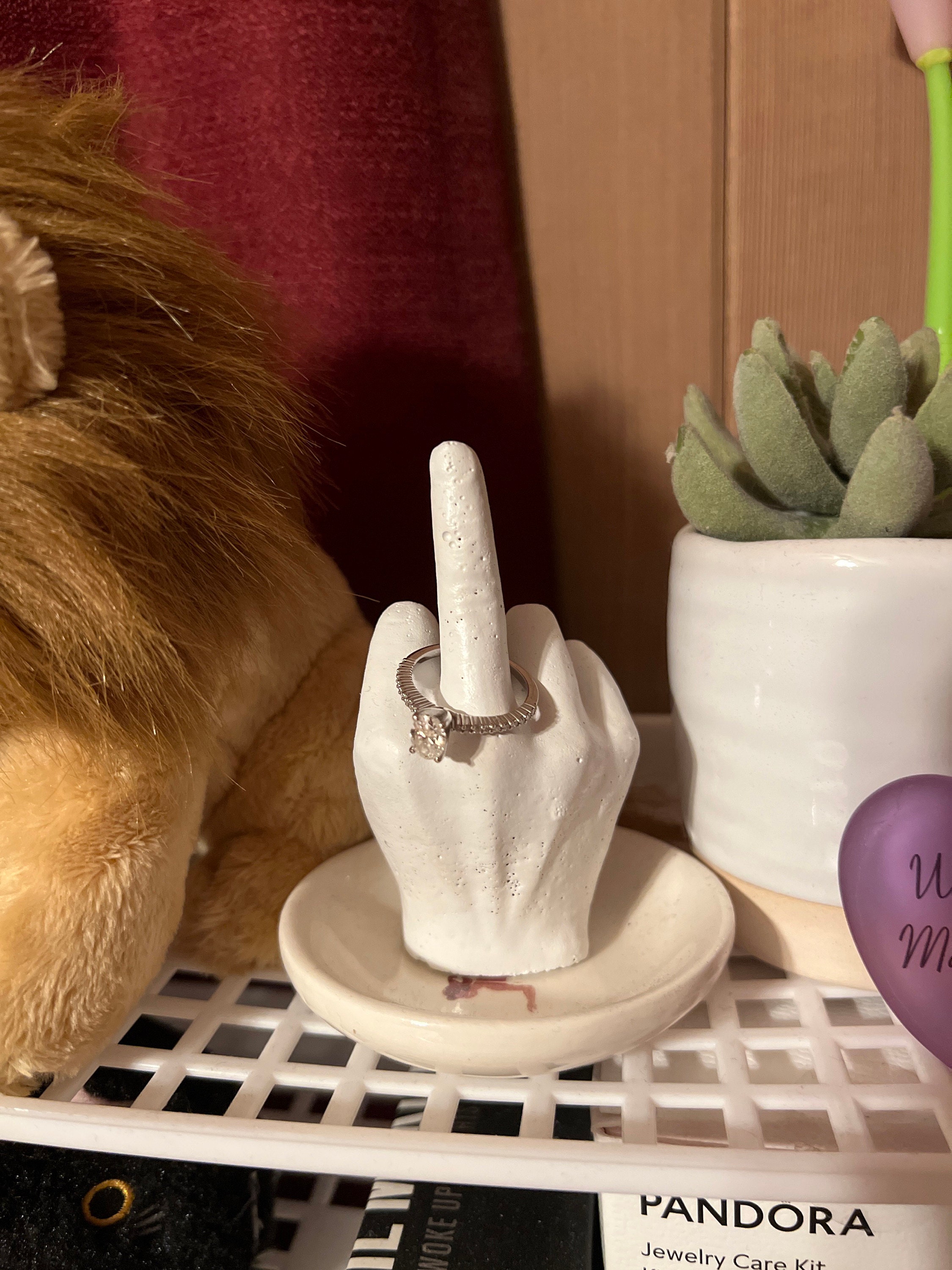 These are my ring holder middle finger made out of concrete and available in several colors.