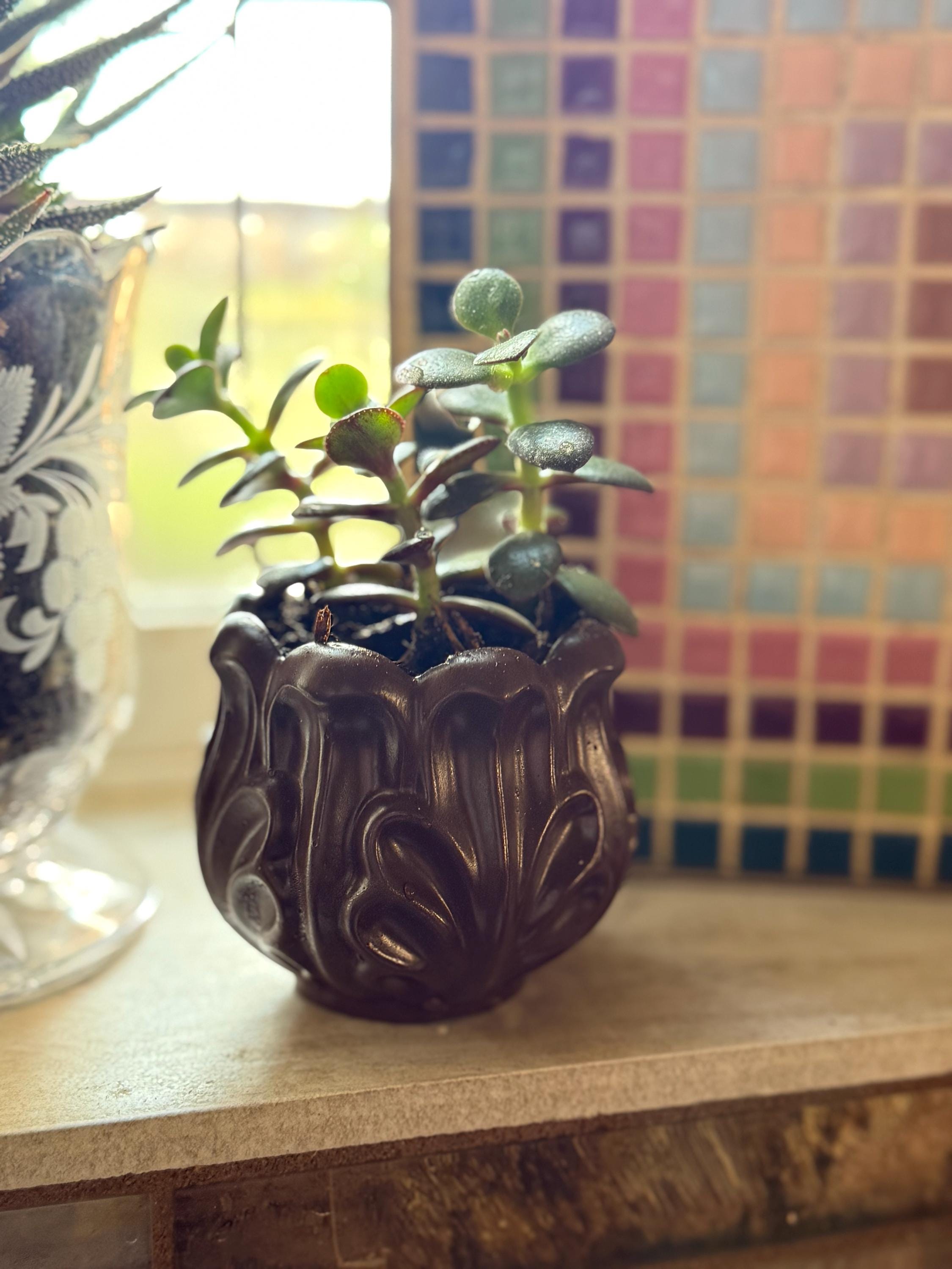 Bring a touch of sculptural poetry to your desk, shelf or windowsill with these handmade mini planters. Each pot is individually hand‑poured from durable concrete, sanded smooth and then hand‑painted in one of three rich hues: Brown, Tan, or Rose Gold. The flowing leaf motif draws inspiration from vintage glassware and modern Art Deco, blending timeless elegance with minimalist charm.